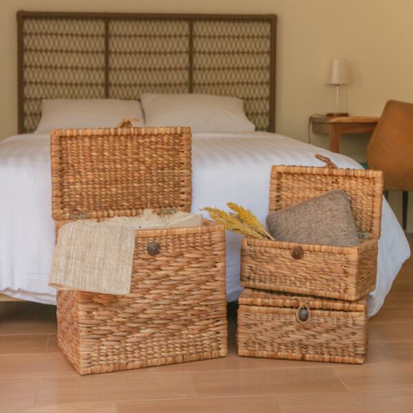 La jacinthe d’eau est le matériau principal durable de notre panier thoracique rectangulaire simple avec un couvercle à charnière. Le grand bouton avec lequel Kelana est fermé se distingue comme un élément décoratif.